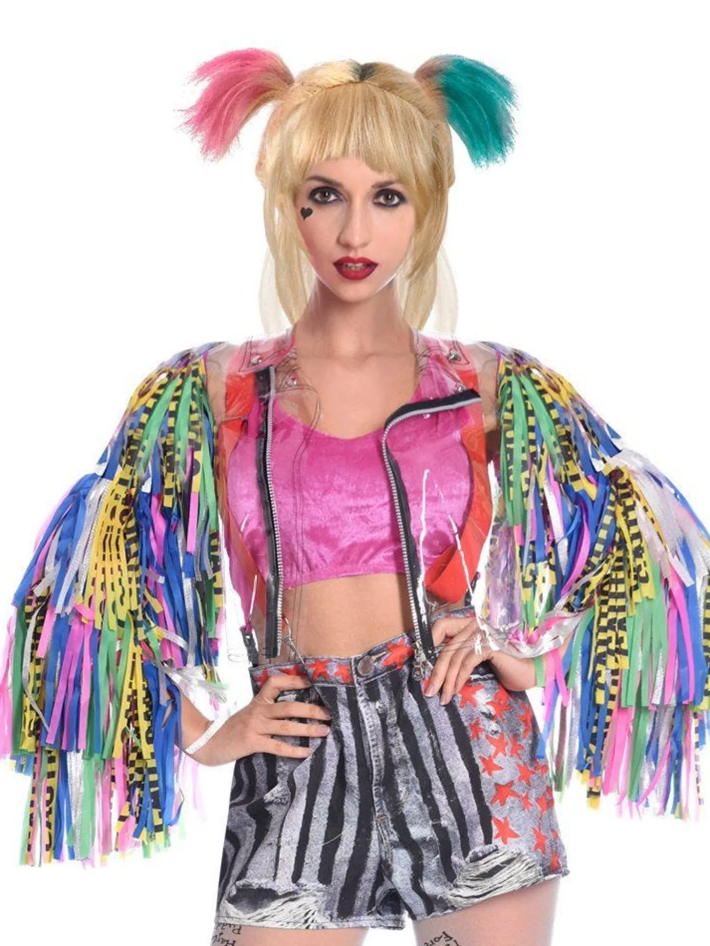 Brightly Coloured Streamers And Cut Up Caution Tape Make Up The Sleeves Of This Officially Licensed Harley Quinn Jacket, Which Has A Clear Plastic Body.