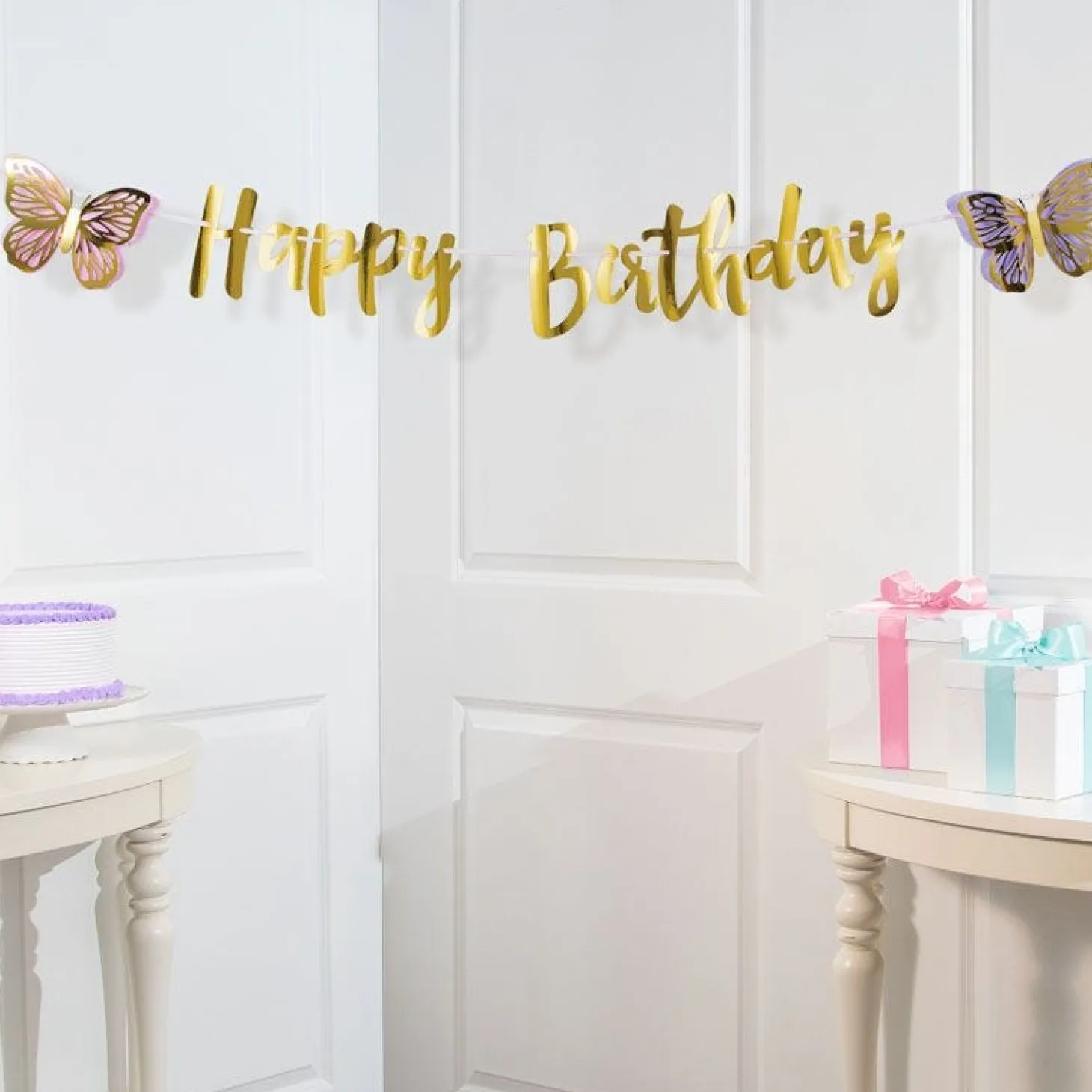- Happy Birthday Gold Foil Banner With 3D Butterflies