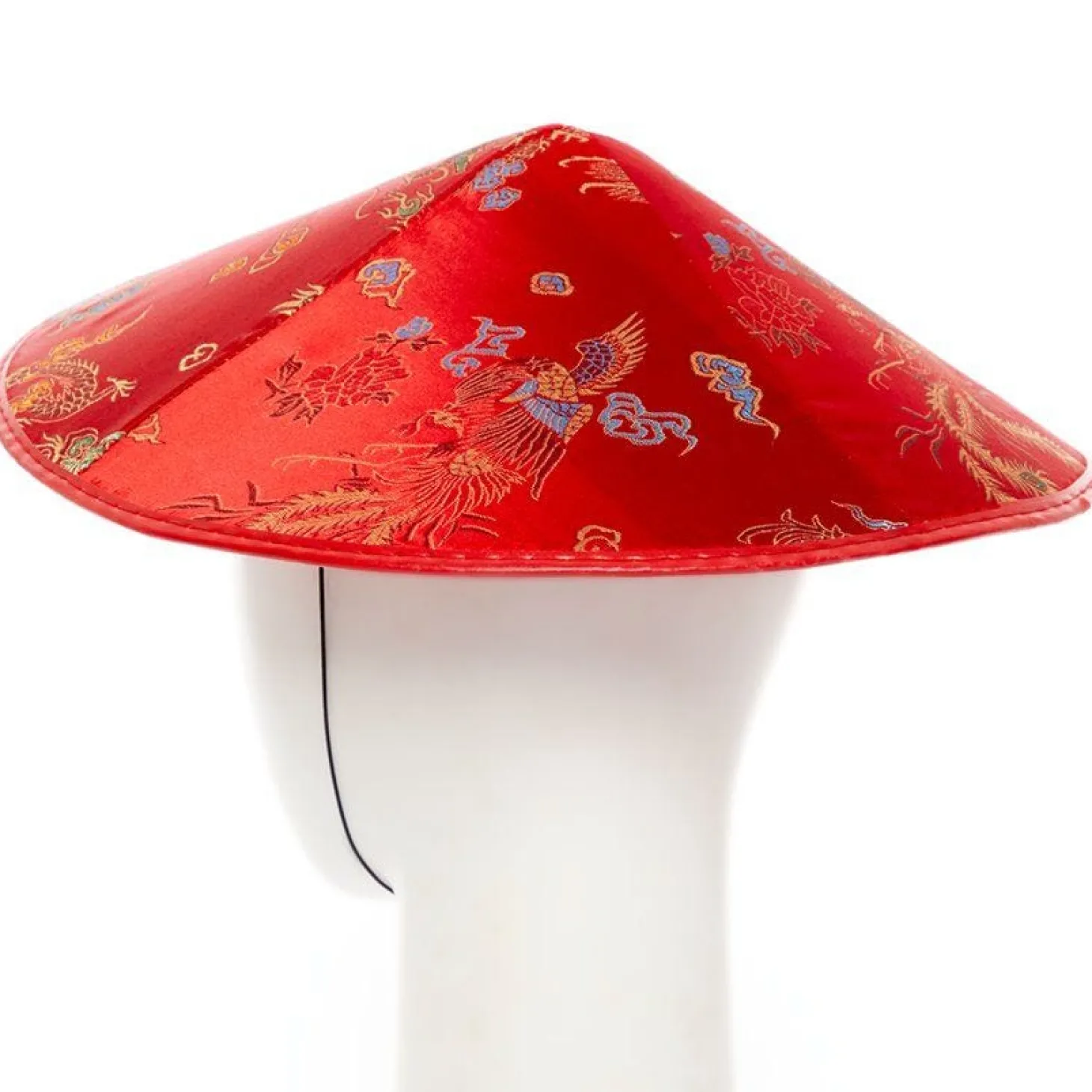 This Red Conical Hat Is Embroidered With Beautiful Scenes Of Ornate Flowers, Its A Perfect Addition To Your Costume.