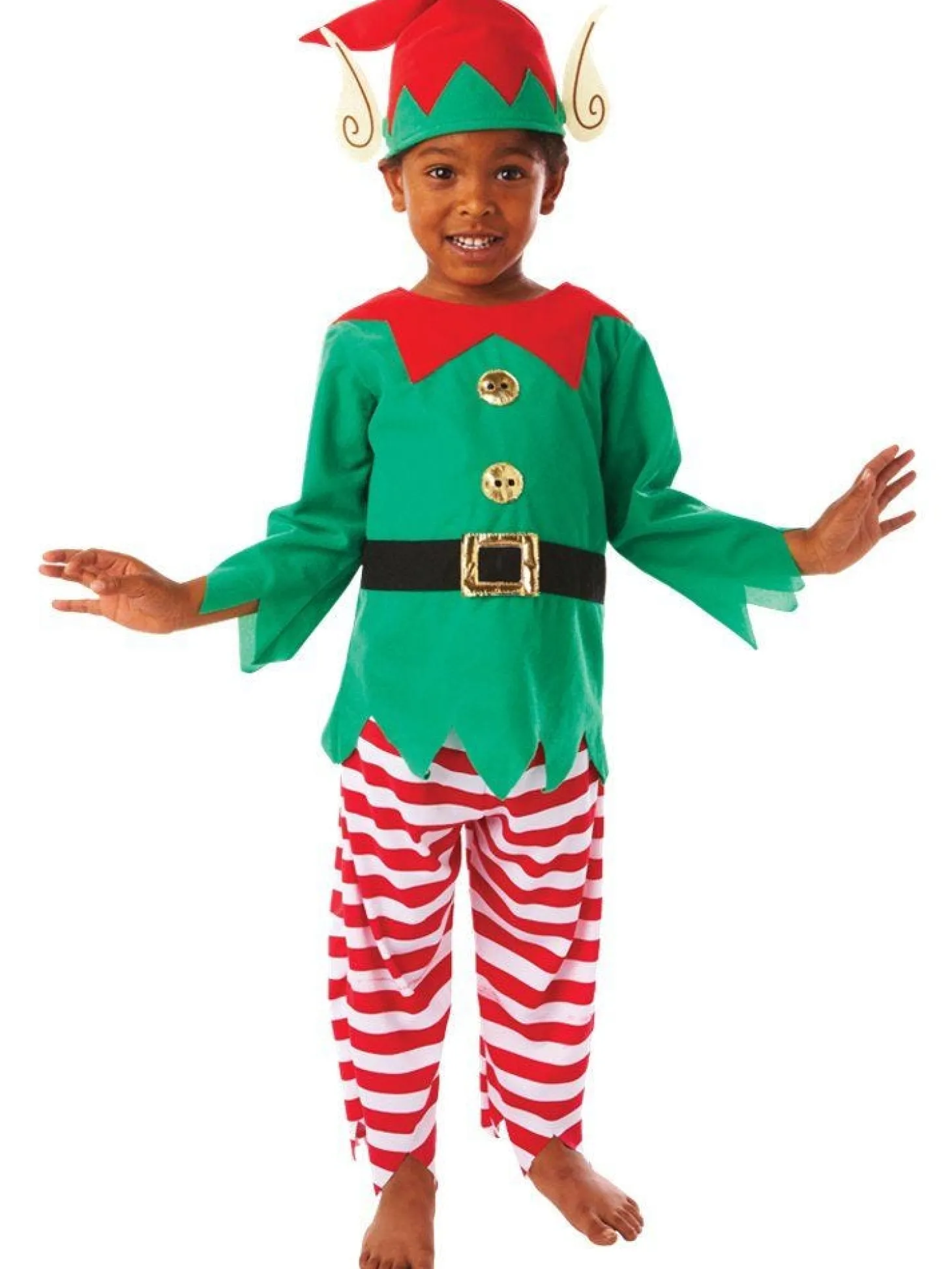 Believe In Your Elf This Christmas With An Adorable Santa’s Helper Costume! This Three Piece Outfit Features A Green Velour Top With Red Trim, Golden Fabric Buttons And Belt Which Fastens At The Back With Velcro, A Pair Of Red And White Striped Trousers, And A Cute Festive Pointy Hat Complete With Pointy Elf Ears.