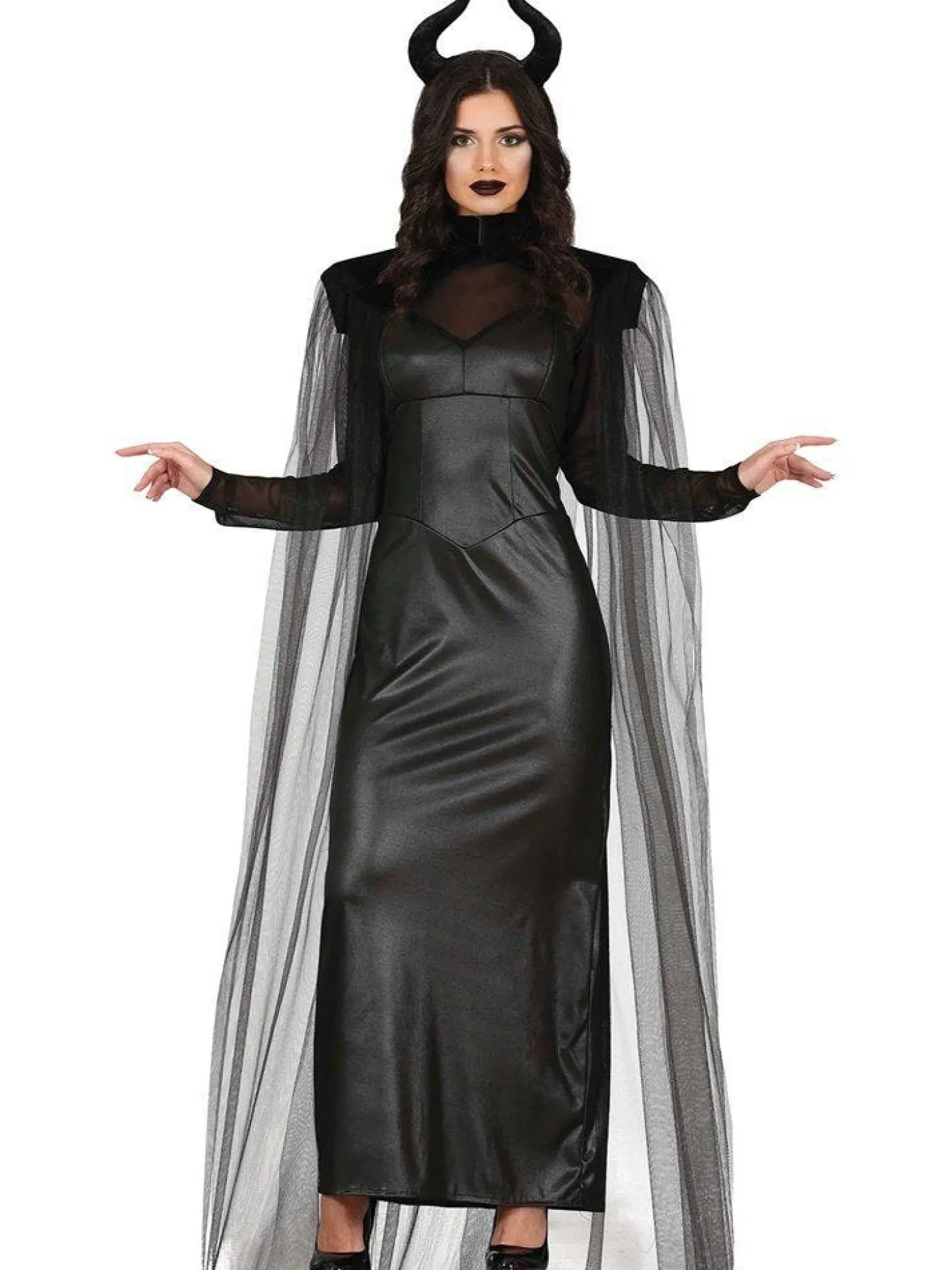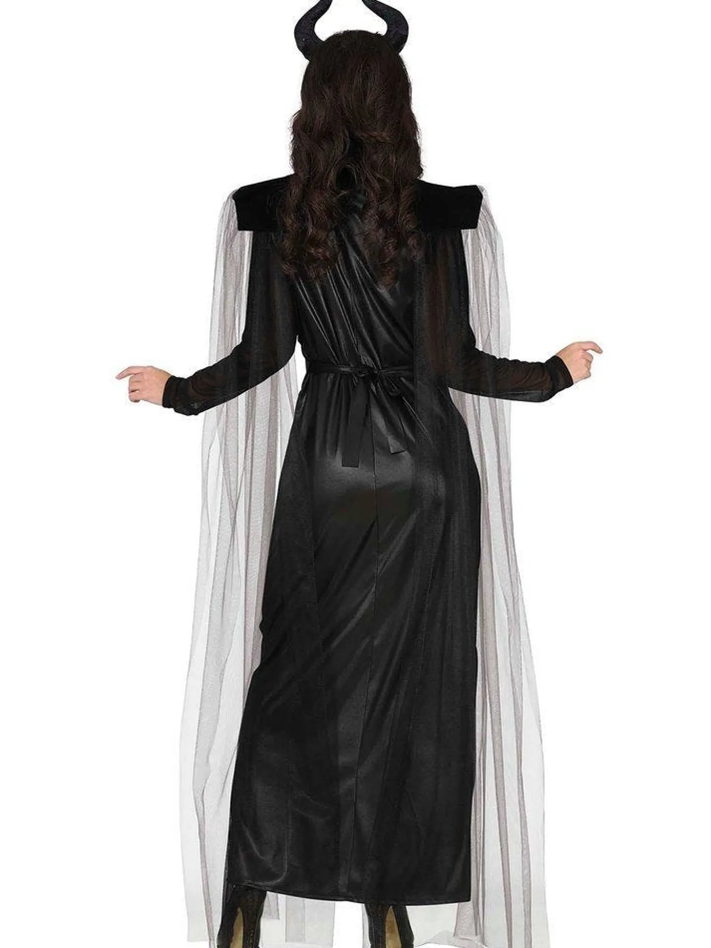 Walk With Us Once Upon A Nightmare In This Evil Fairy Costume! The Fitted Black Dress With A Padded, Horned Headband And Sheer Cape That’s Structured Around The Shoulders For A Power Suit Meets Fairytale Vibe.