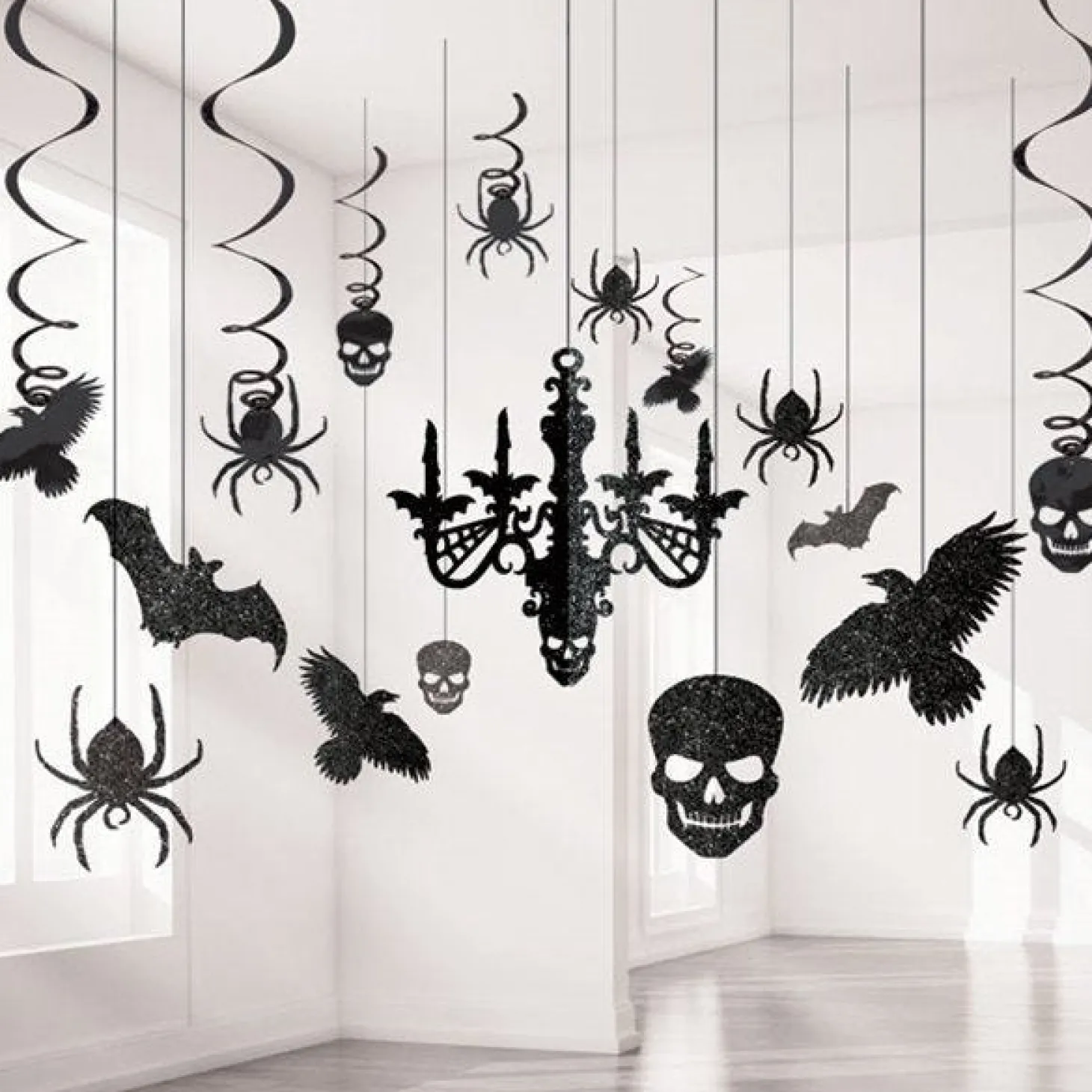 Suspend This Intricate Black Glitter Chandelier From The Centre Of Your Room And Surround It With The Assortment Of Creepy Creature Cut-Outs To Set A Really Spooky Scene. From Bats, Ravens And Spiders To Skulls Dangling From Swirly Strings, This Kit Is Perfect For A Halloween Party.