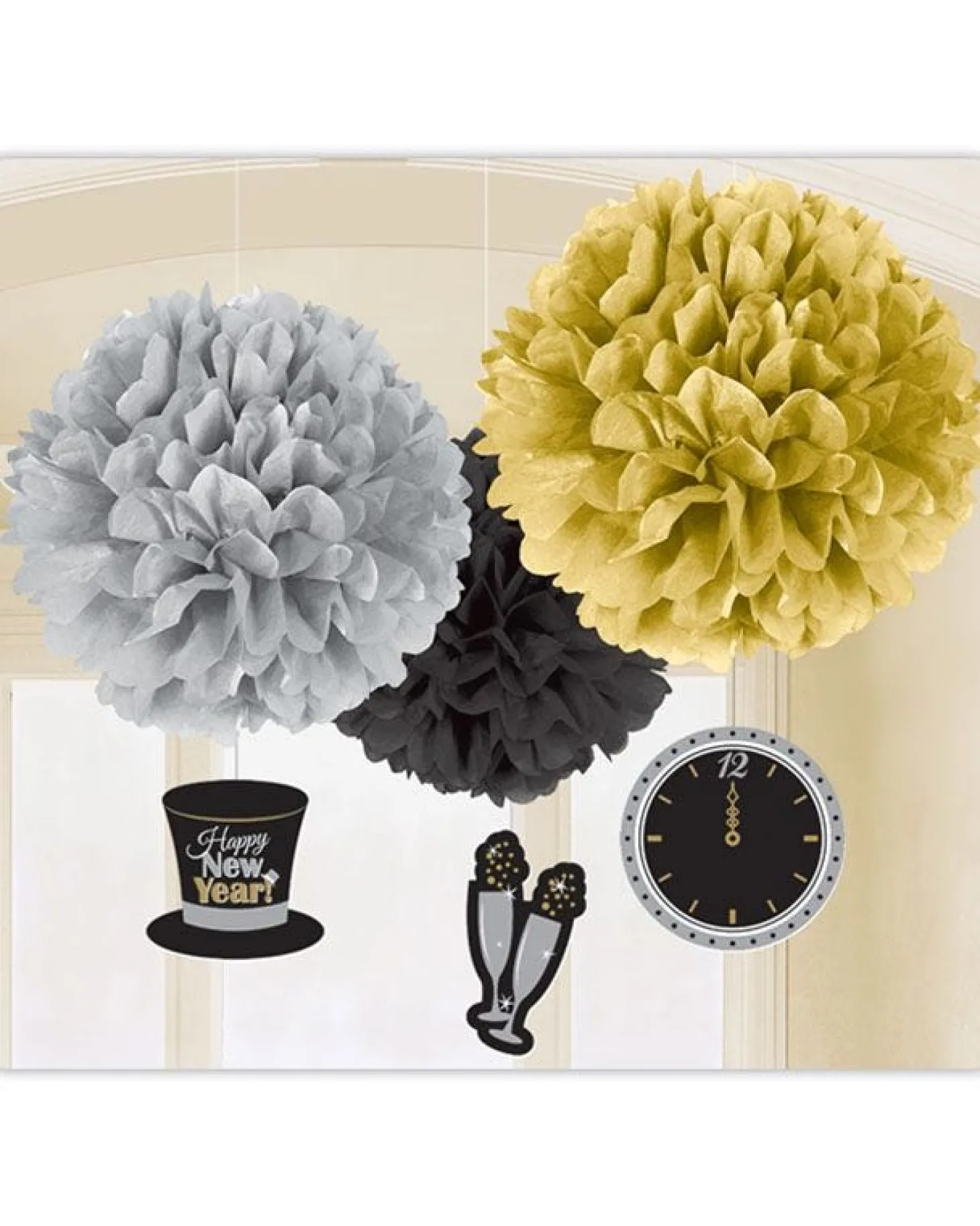 If You’Re Welcoming In The New Year With A Party Or Family Gathering, You Can Get Your Room Ready In An Instant With These Pretty Pom Pom Decorations. In Gold, Black And Silver, Each Pom Pom Opens Up Into A Delicate Fluffy Flower Shape. A Different Decoration Hangs From Each – A Top Hat, Champagne Flutes And A Clock Showing Midnight.