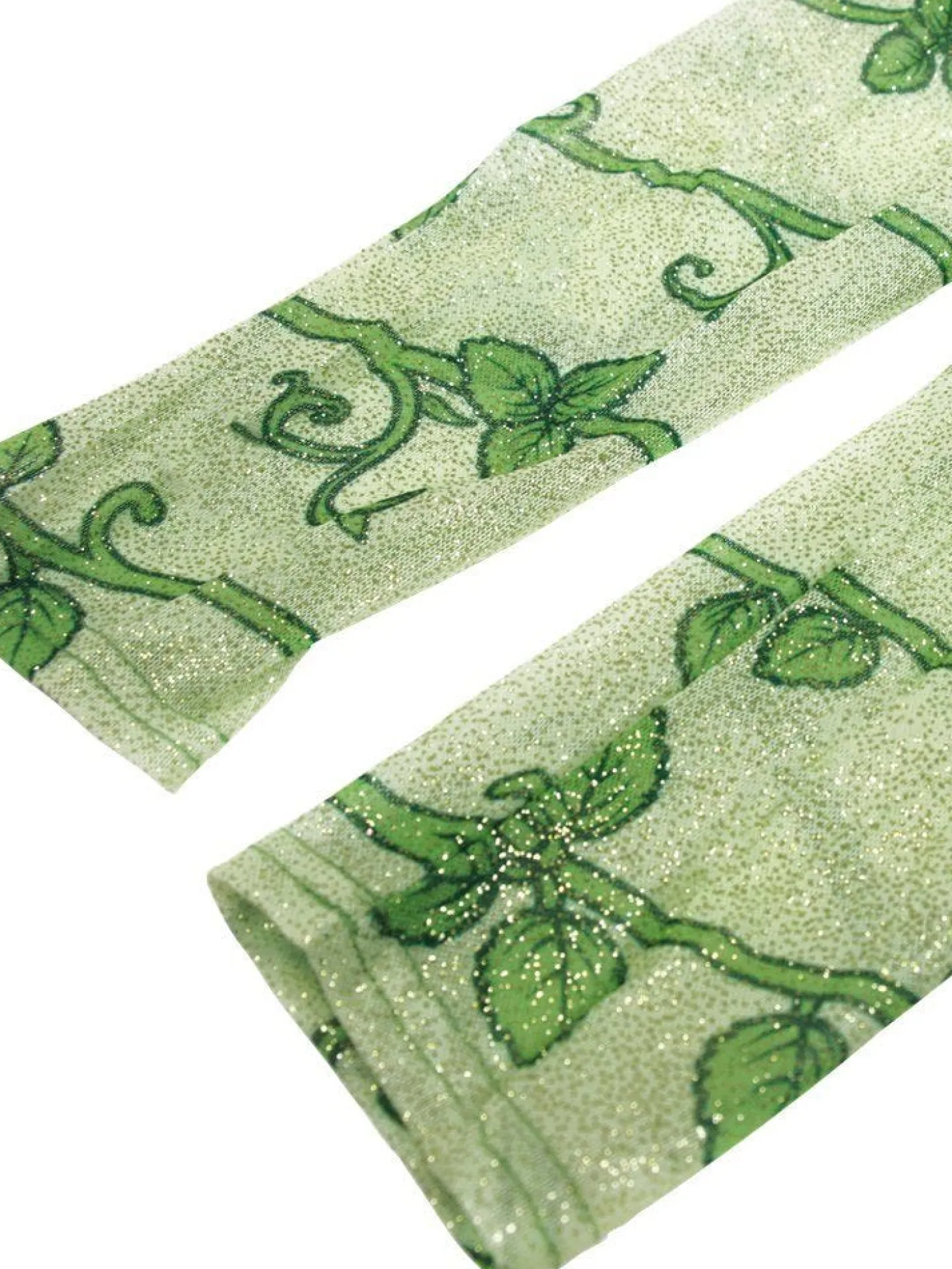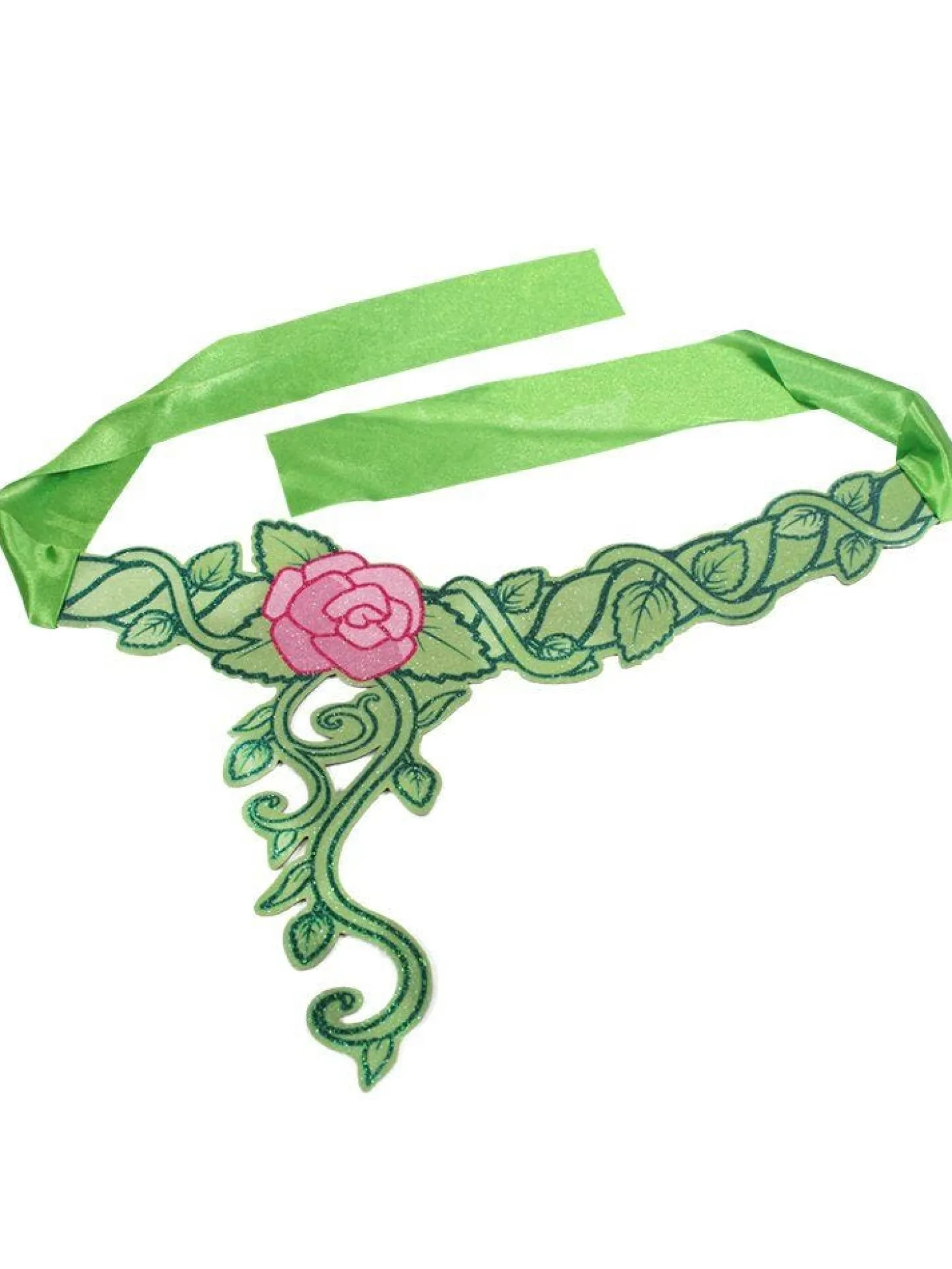 A Three Piece, Deluxe Poison Ivy Costume Consisting Of A Semi-Sheer Green Top With Peplum To Waist And All Over, Printed Rose Detail. A Pair Of Green, Stretchy Leggings With Elasticated Waist Boasting Glittering, Semi-Sheer Fabric To Lower Leg With Trailing Ivy Print And A Felt, Fabric Belt With Printed, Sparkling Rose And Ivy Detail.