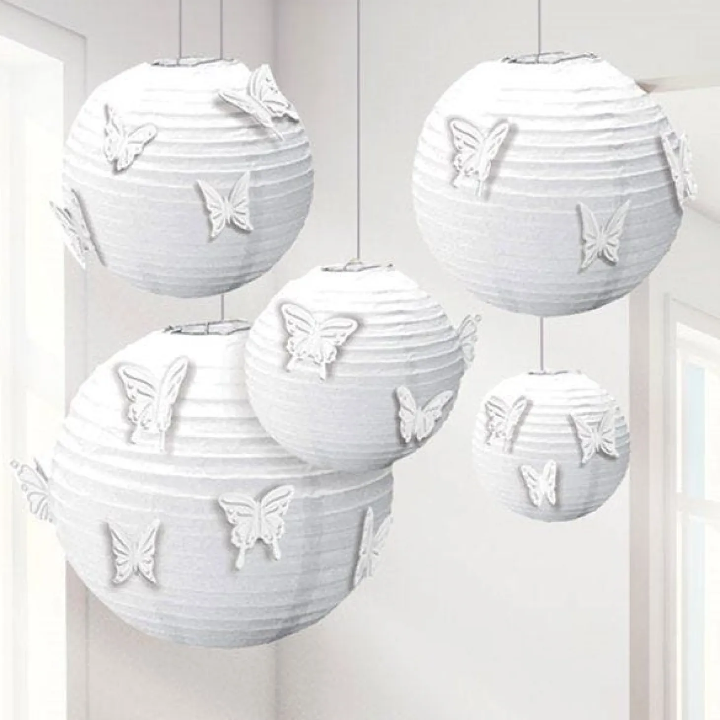 White Paper Lanterns With Butterfly Attachments (5Pk)