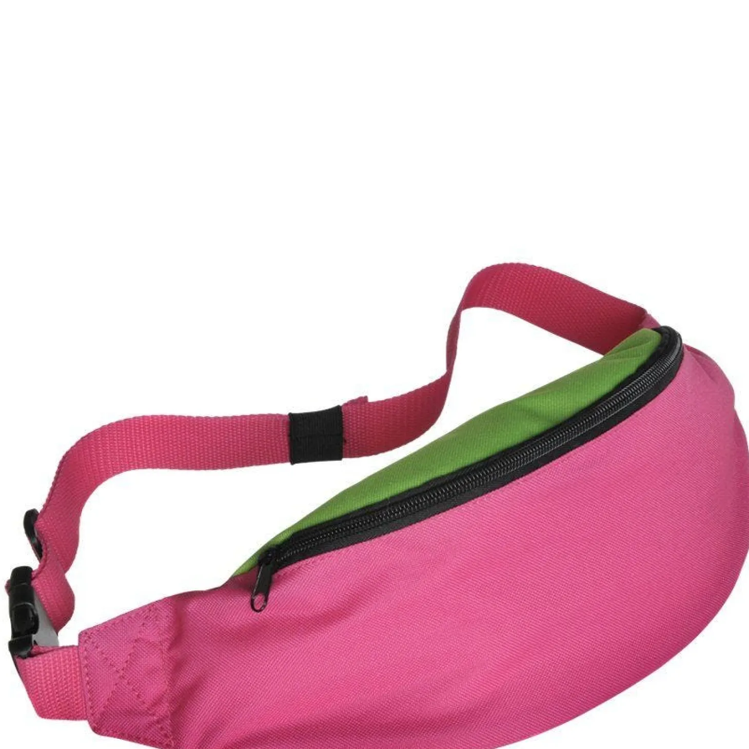 Pink Hip Hop Bum Bag With Green Accents And A Large Zip. It Fastens Around The Waist With A Clip.