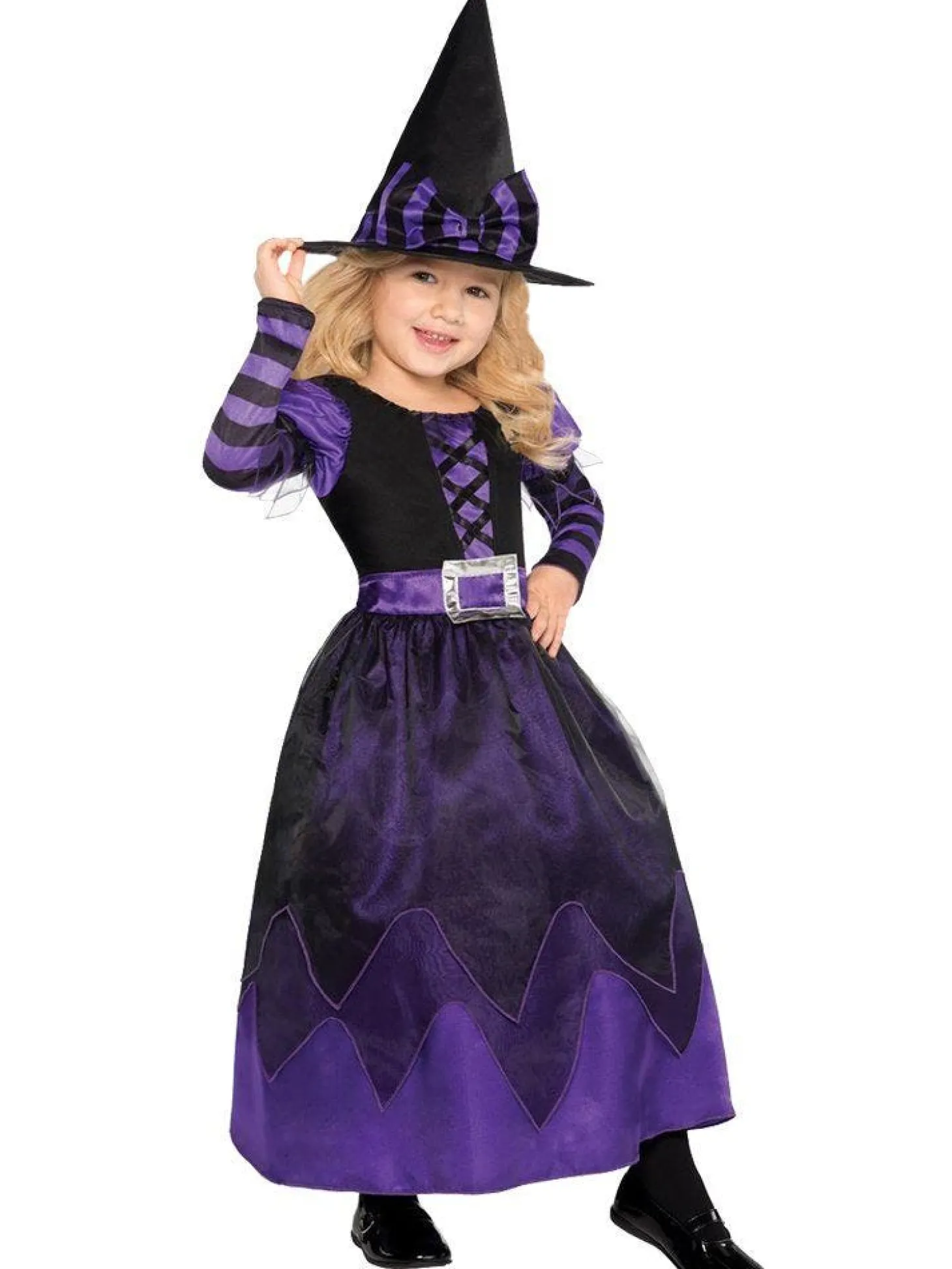This Positively Perfect Little Witch’s Costume Comes As A Gorgeous Long-Sleeve Black And Purple Dress With An Ankle-Length Layered Skirt, Faux Bodice Detailing And A Mock Belt Detail Around The Waist. Also Included Is A Pointy Witch Hat Which Has A Matching Black And Purple Striped Bow Across The Front. Perfect For Halloween, Especially When Paired With A Witch’s Broom.