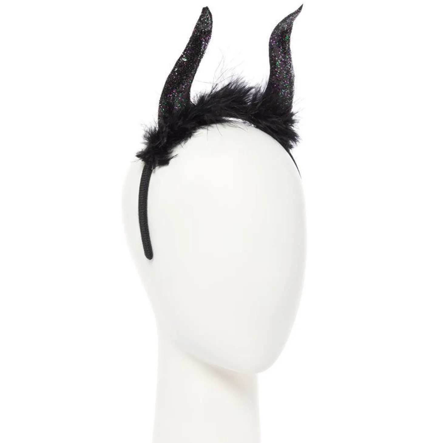 Show Your Wicked Side This Halloween With A Black Glittery Horn Headband! It Features Two Green And Purple Glittery Horns With Black Marabou Feathers On A Covered Headband. 100% Polyester. 11Cm