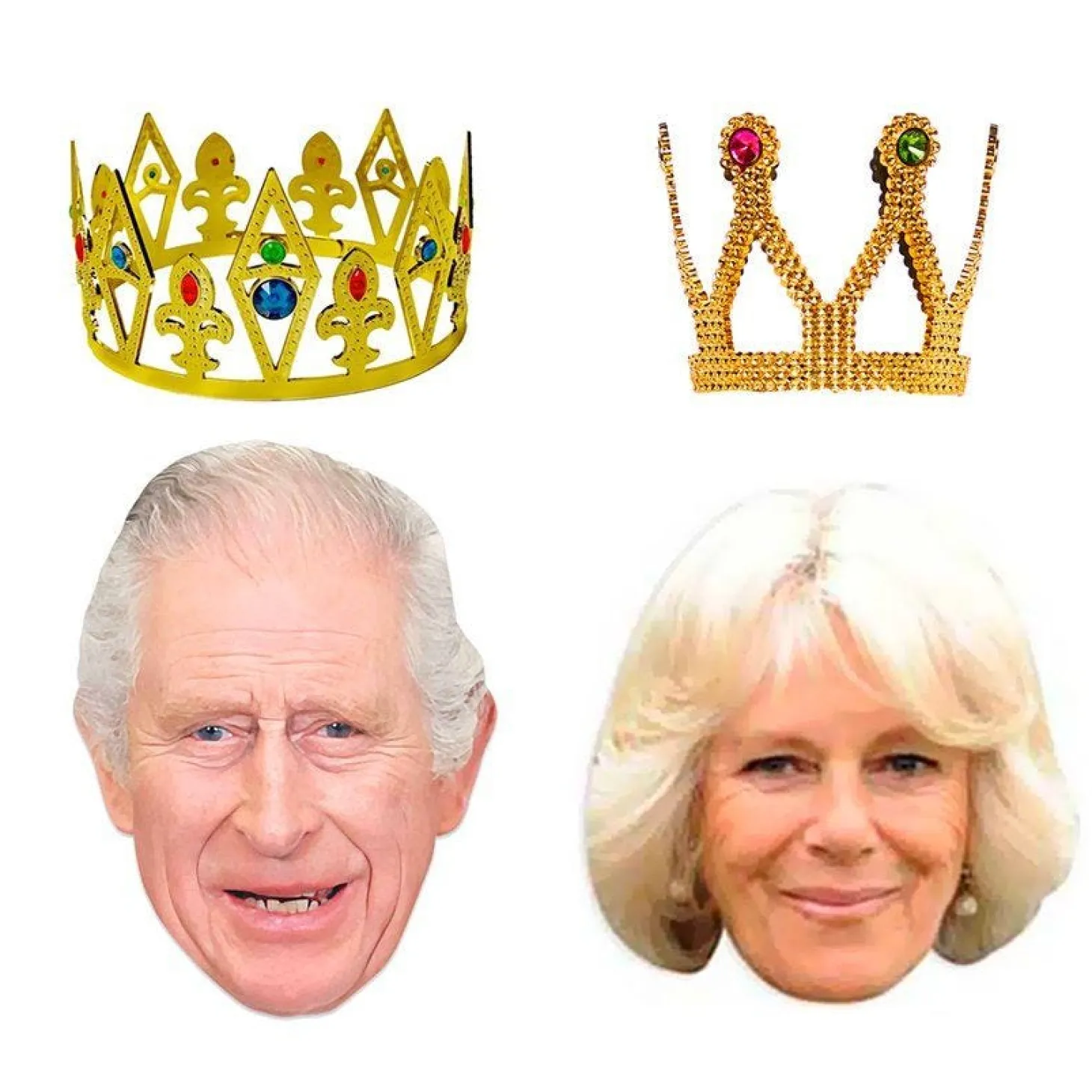 Party Like Royalty With Our Charles And Camilla Kit. This Coronation Party Pack Consists Of A Mask Of Both The King And The Queen Consort, As Well As A Gold King’s Crown And A Mini Gold Queen Crown. Now You Can Be The Party King And/Or Queen At Your Coronation Party!