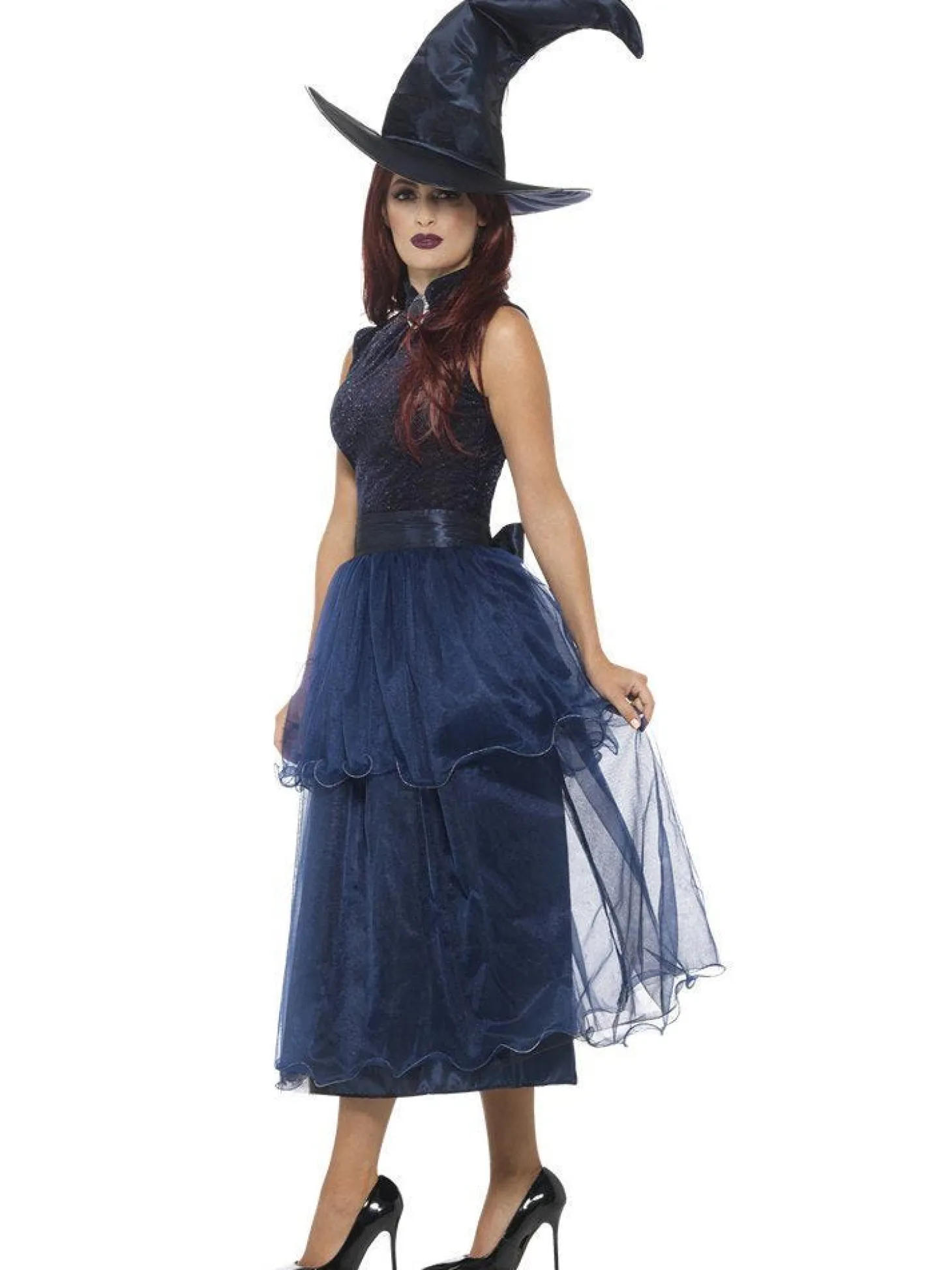 Forget Black And White Magic – This Year It’s All About Midnight Blue! The Velvety Soft Bodice Is Covered In A Sparkling Silver Glitter, Matched With A Sheer Blue Long-Length Skirt And A Sash To Tie Around The Waist. The Neckline Has A Gorgeous Holographic Brooch And There’s A Stylish Curve To This Hat That Will Really Help You To Stand Out.