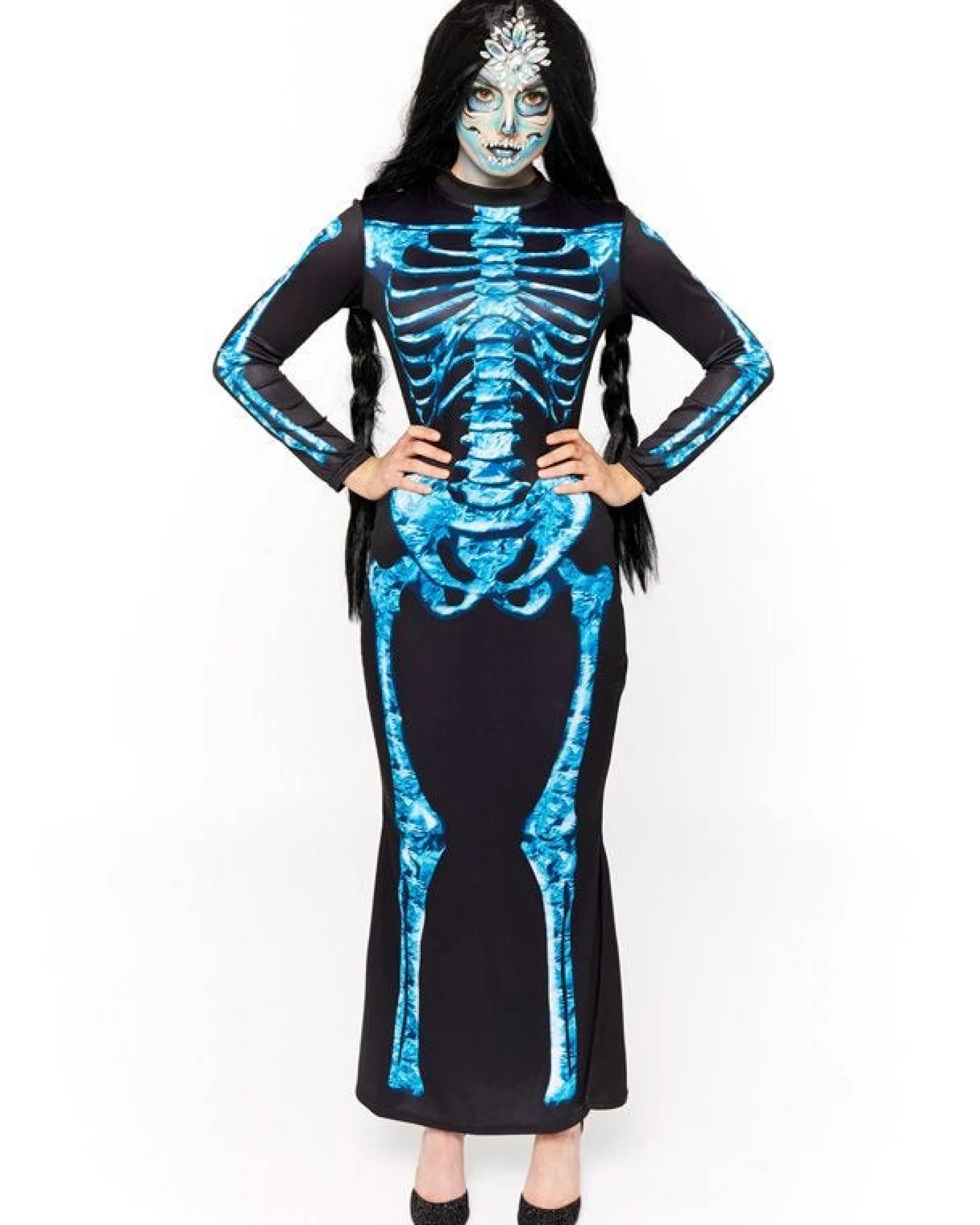 Diamonds Are A Ghoula€™S Best Friend! For A Skeleton Outfit With A Difference, Style This Glamorous Long Black Dress With Blue Diamond-Effect Skeleton Design Up With Some Sparkling Accessories Or Dress It Down For A More Casual Halloween Look. Who Said Spooky Couldna€™T Be Stylish?