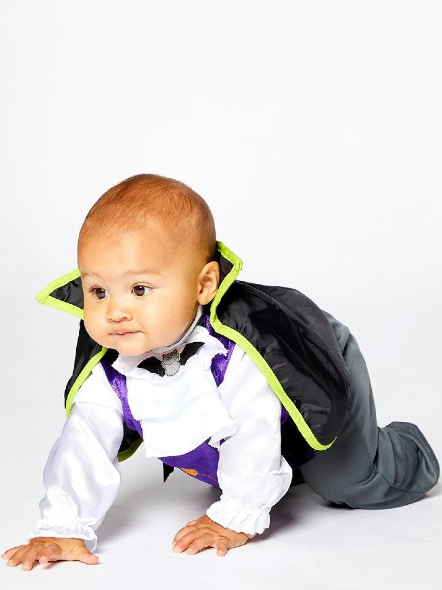 This Has Got To Be The Cutest Little Blood Sucker Ever! This Dapper Dracula Costume Includes A Pair Of Comfy Grey Trousers, A Ruffled Shirt With Faux Waistcoat Along With A Cape And Some Adorable Smiley Bat Details.