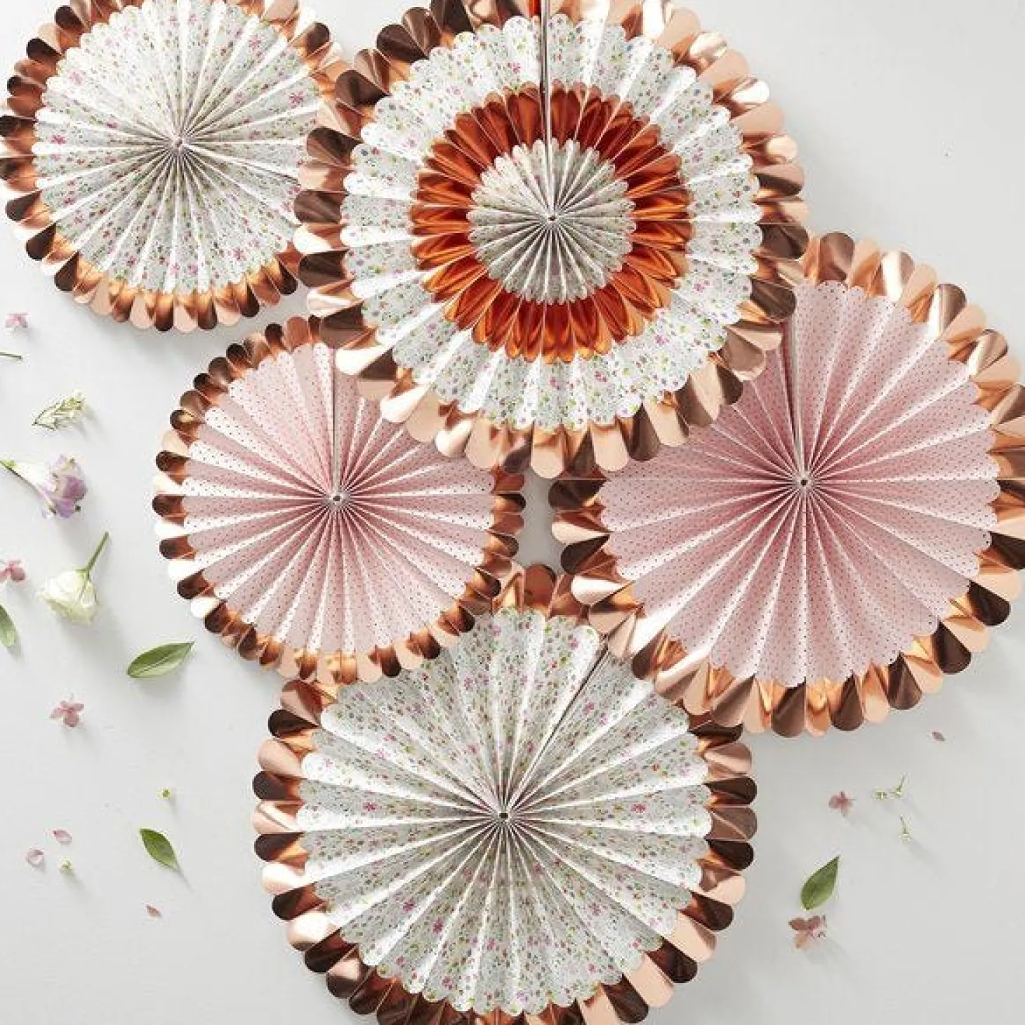 Ditsy Floral Rose Gold Foiled Fan Decorations – 38Cm (5Pk)