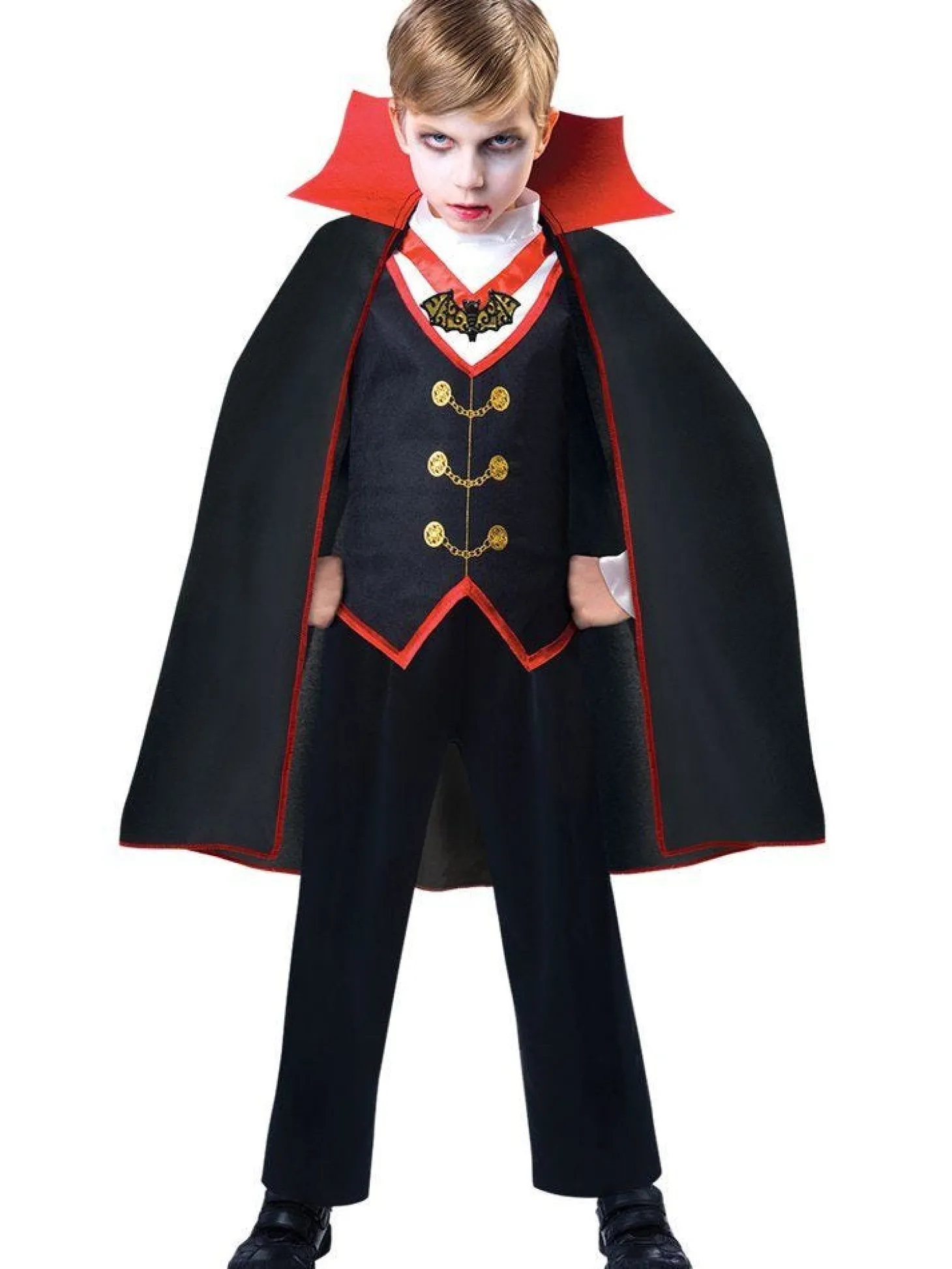 Straight From The Casket Comes This Dracula Boy’s Costume Featuring A Cape With Stand-Up Collar And A Faux Waistcoat Front With Attached Faux Shirt And Bat Accent. If Your Little One Has A Thirst For Blood And Sweeties This Halloween, This Costume Is Just Perfect For Trick Or Treating!