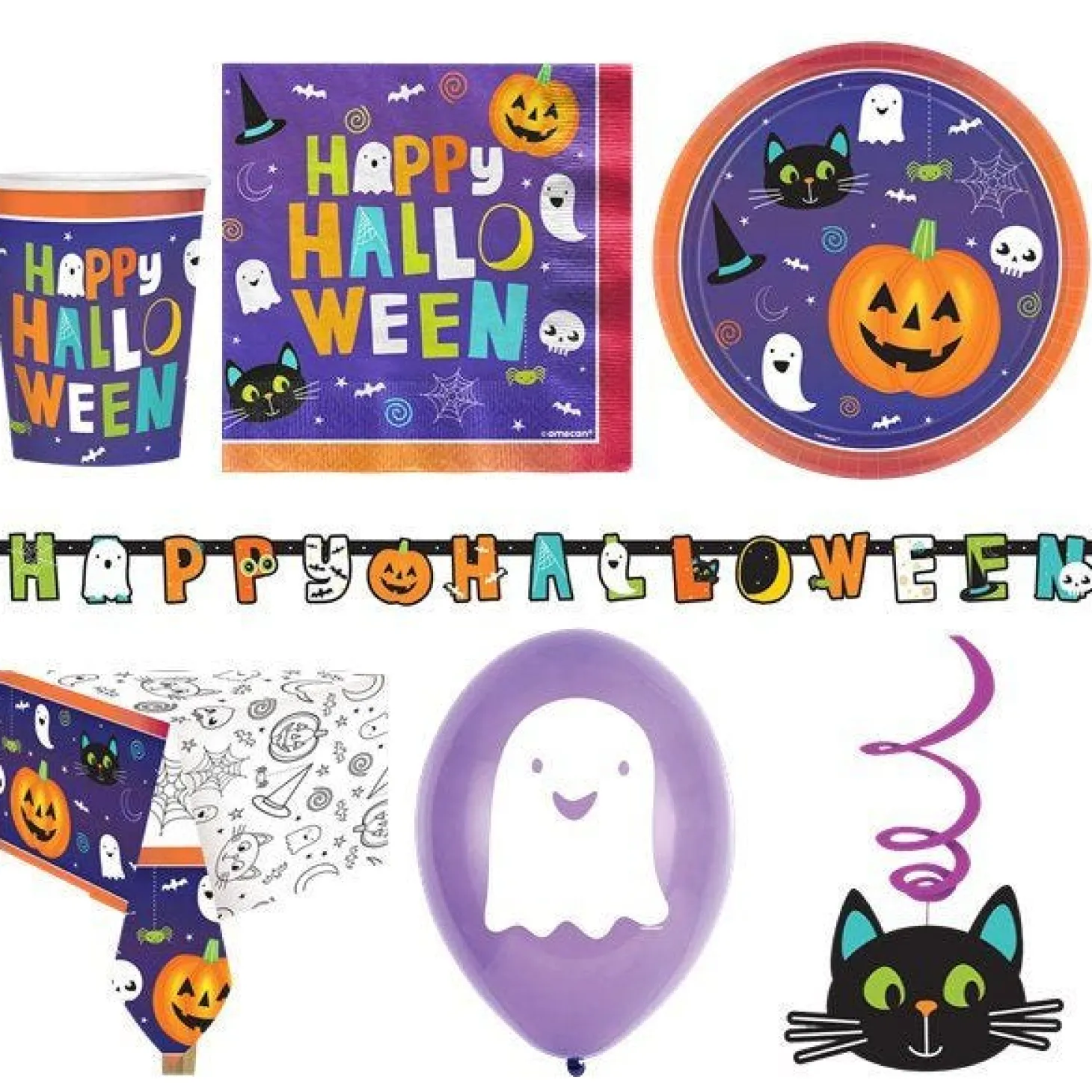 This Handy Kit Includes 16 Paper Plates And 16 Paper Cups, Along With 16 Paper Napkins. The Matching Tablecloth Will Protect Your Table From Spills And Wipes Clean Easily. To Help You Decorate, There Are 6 Cute Ghost Latex Balloons, A Matching Letter Banner And 6 Matching Hanging Swirl.