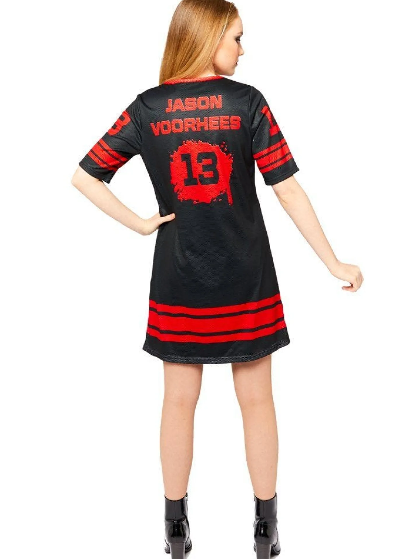 Show Your Love For The Incredible Villain Of Friday 13Th, Jason Voorhees, With A Black And Red Hockey Jersey Style Dress. The Black Tshirt Dress Features Red Stripes, A “13” On Each Shoulder, Name And Number On The Back And Iconic Hockey Mask On The Front.