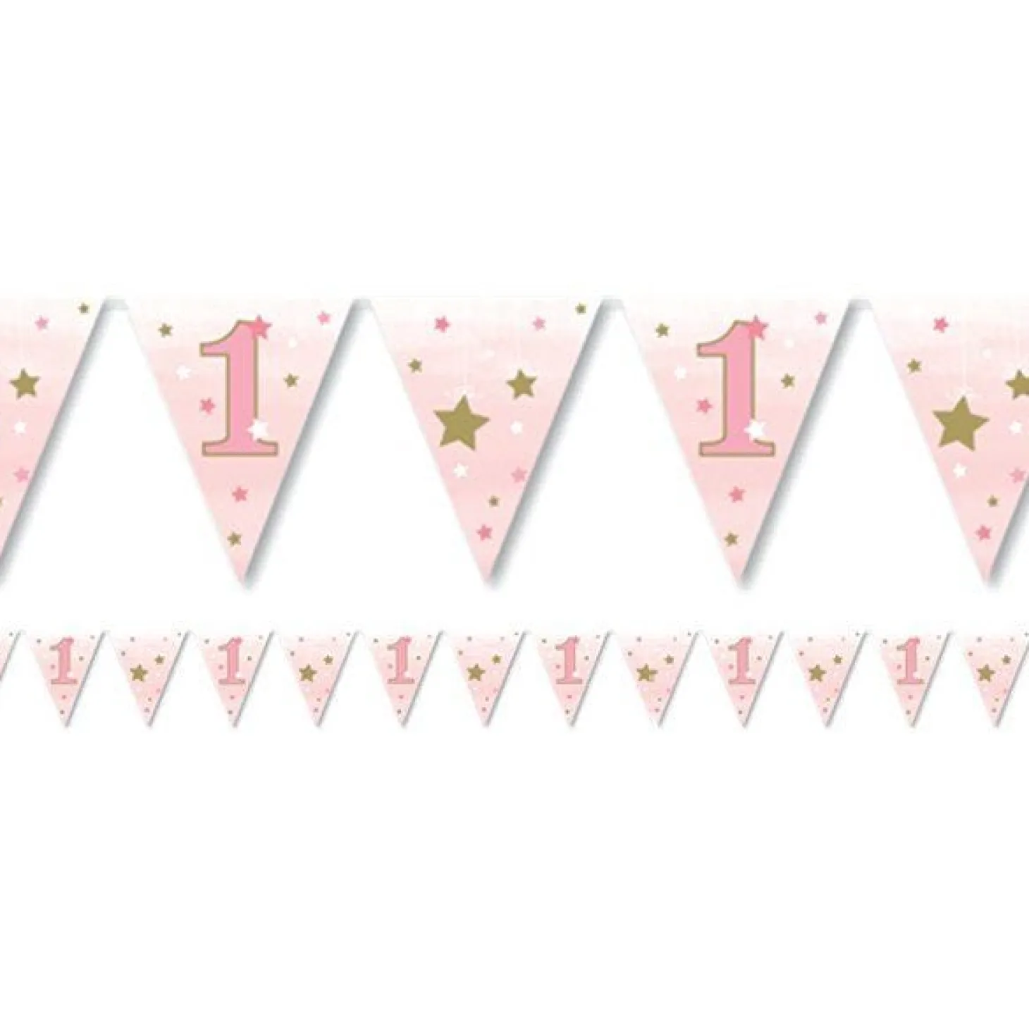 You Only Turn 1 Once! Celebrate By Decorating With This Cute Baby Pink Paper Bunting. The 11 Flags Feature Alternating Patterns Of Gold Stars And The Number ‘1′. Coordinate With The Matching One Little Star Tableware For A Twinkling First Birthday Celebration.