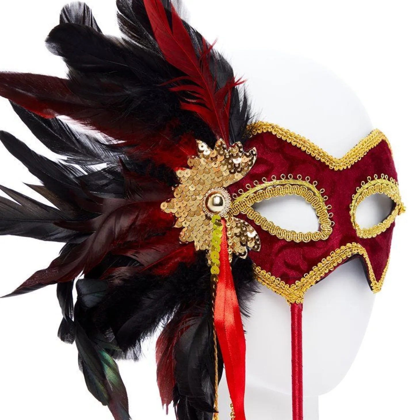 Choose This Red And Gold Mask For Your Big New Year’s Eve Bash Or Masquerade Themed Party. With Gold Braiding Trimming The Edges And A Large Sequin Embellishment To One Side, There’s Plenty Of Sparkle. Simply Hold It Up To Your Face Using The Attached Stick – Wrapped In Ribbon For An Elegant Finishing Touch.