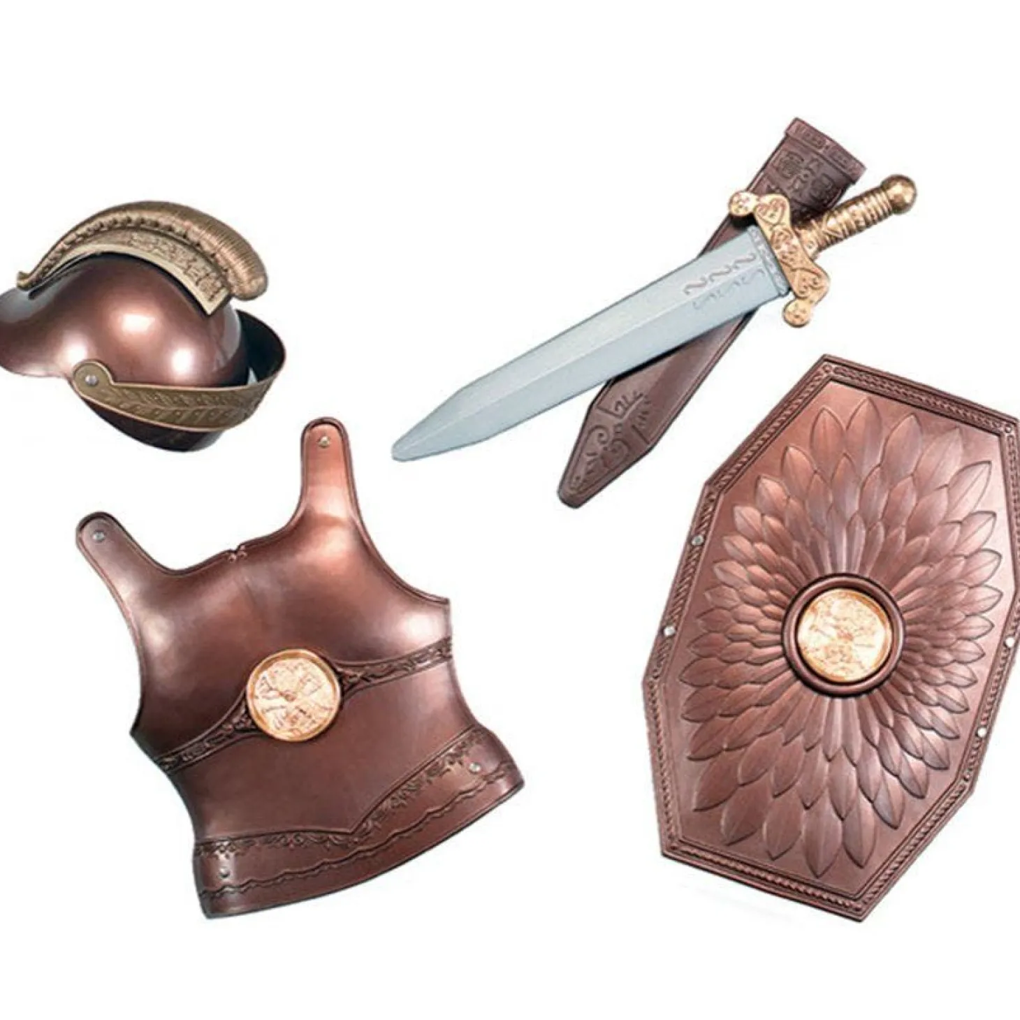 Does Your Child Have What It Takes To Become A Roman Soldier? This Superb Roman Armour And Weapons Set For Kids Is The Perfect Accessory For His Roman Costume. The Set Features A Helmet, Shield, Breastplate And A Sword With Sheath Everything Your Child Will Need To Become A Roman Fighter. Shield Measures 43Cm X 31Cm, Breastplate Measures 36Cm X 30Cm, Sword Measures 49Cm.