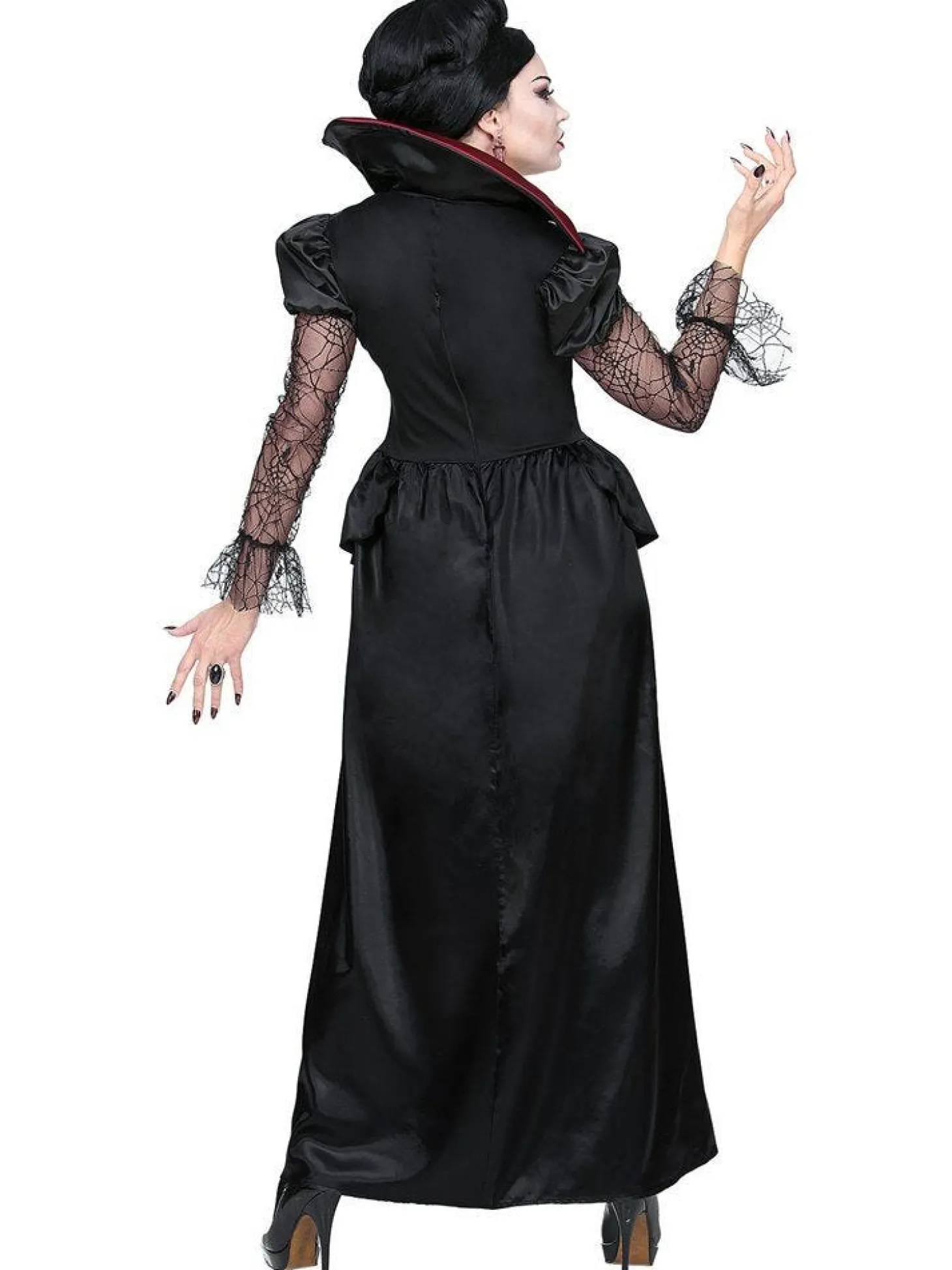 This Dark, Elegant Vampires Costume Is Perfect For A Super Dramatic, Gothic Halloween Costume! A Long Black And Dark Red Dress With Spiderweb Lace Detailing And Long Lace Sleeves, The Whole Thing Is Perfected With A Choker And Upright Collar To Frame Your Neck Perfectly.