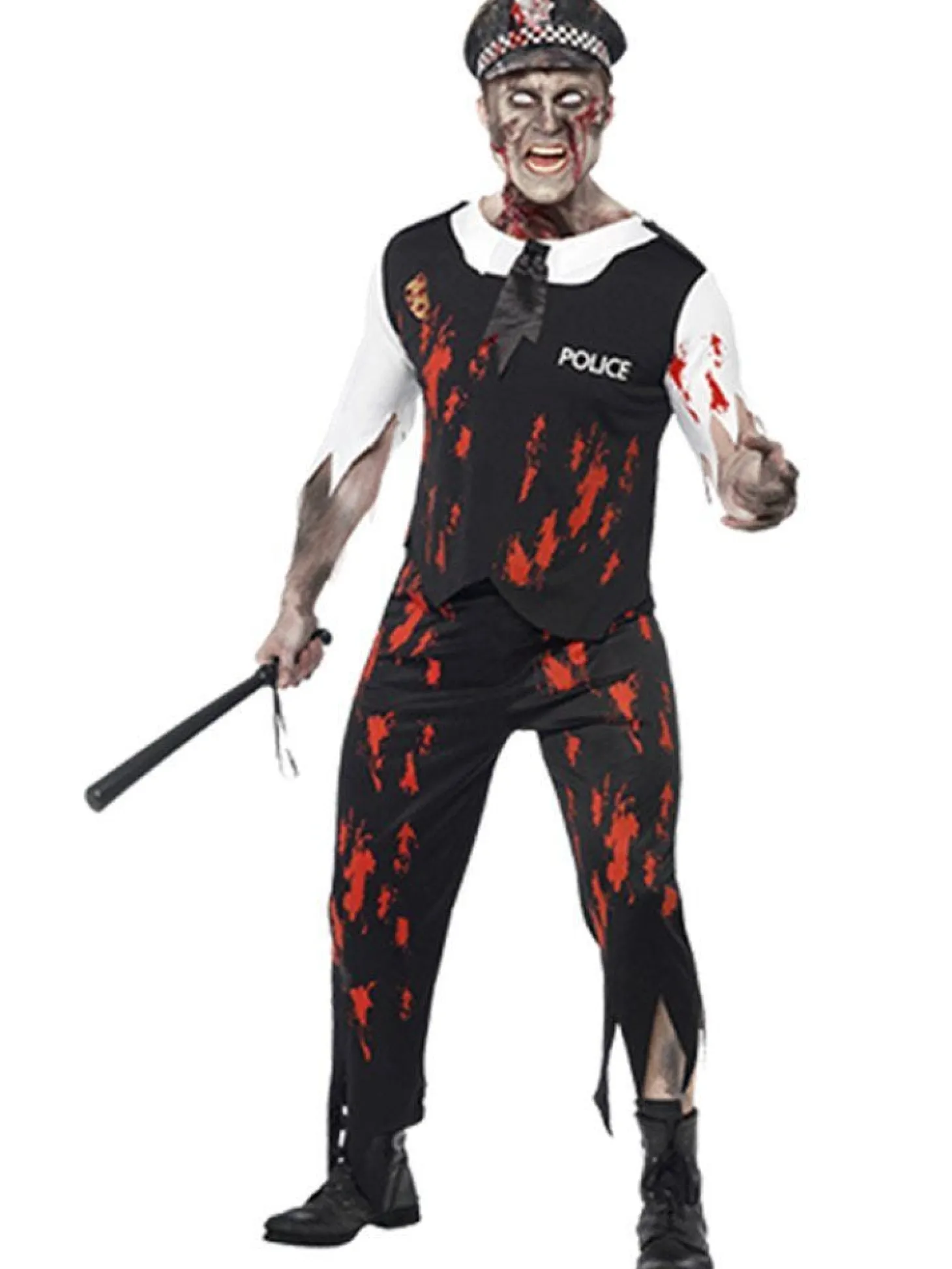 This Three Piece Creepy Zombie Policeman Costume Features A One-Piece, Blood Stained, Stretchy Top Which Simply Slips Over The Head. The Top Is Made To Look Like A Bullet Vest With Shirt And Tie Underneath And Features Gory Latex Wound To Chest. Also Included Are A Pair Of Black Tattered, Bloodstained Trousers And A Realistic Looking Police Hat. 100% Polyester. Dry Clean Only.
